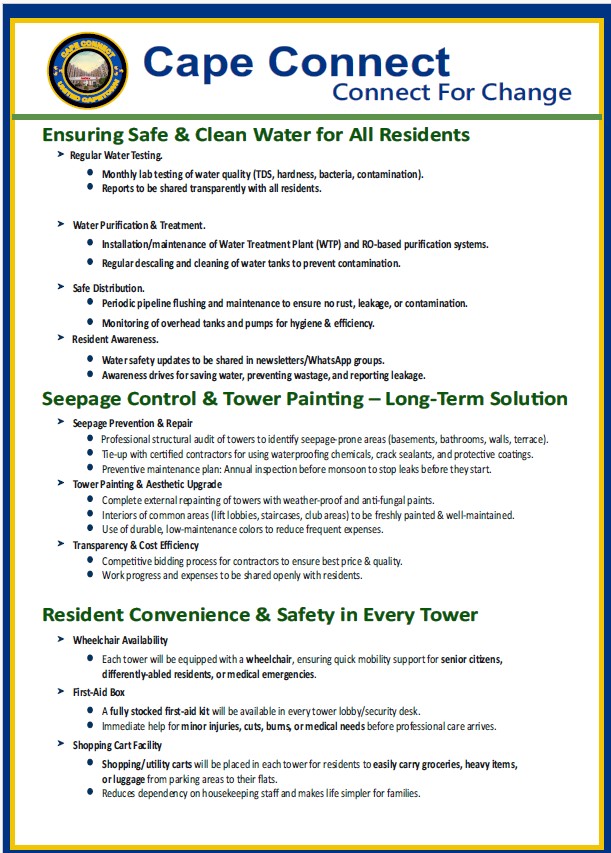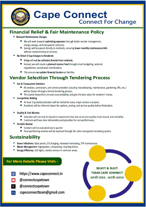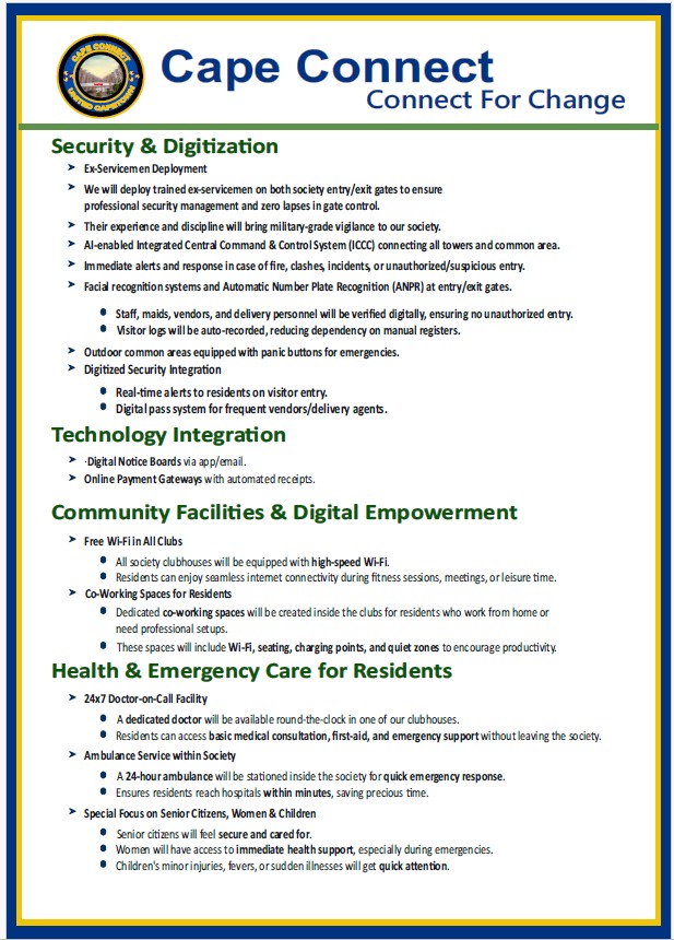 The Cape Connect Team is coming up with democratic idea. We are going to introduce a new participatory governance model aimed at increasing transparency, accountability, and direct involvement of residents in the decision-making processes of our society. Inspired by the concept of Panchayati Raj, we will form Resident Committees that will work closely with the AOA Board. These committees will serve as a bridge between residents and the AOA, enabling every voice to be heard and considered in the governance of our community. We believe this model will empower residents, create a more inclusive environment, and lead to more efficient governance of our society.